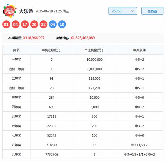 大乐透第2025068期开出奖号为:01、04、17、20、22+04、10。其中前区奇偶比为2:3,三区比为2:3:0,大小比为2:3,后区开出全偶组合。